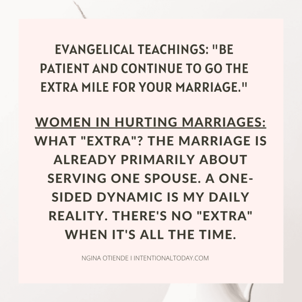 “I was really protective of marriage in general, believing that many spouses don’t take their vows seriously. Now I know that most people of faith will fight for their marriages long after they should have stopped fighting. Frivolous divorces exist, but there isn’t an epidemic of frivolousness. The actual epidemic seems to be the church’s silence about abuse and consequences of unrepentant sin in relationships. A big problem is God’s people propping up erroneous teachings of marriage first, instead of individual welfare first.” Ngina Otiende, Why I’ve Deleted My Books, Courses, and Over 200 Blog Posts